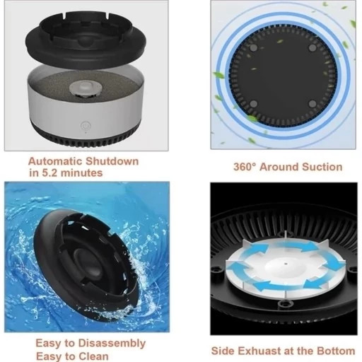 زیر سیگاری الکتریکی مکنده دود دارای فن مکنده دود سیگار ،محل قراردادن سیگار روشن و همچنین محل ریختن خاکستر و ته سیگار است و با دارا بودن 3 فیلتر مختلف غبار گیر و کربن اکتیو ابری و کربن اکتیو فشرده، بوی سیگار و دیگر بوهای محل را میگیرد که نقش بوگیر و تصفیه هوا را دارد.همچنین این فیلتر ها باکتری و گرد و غبار را نیز فیلتر میکنند.
