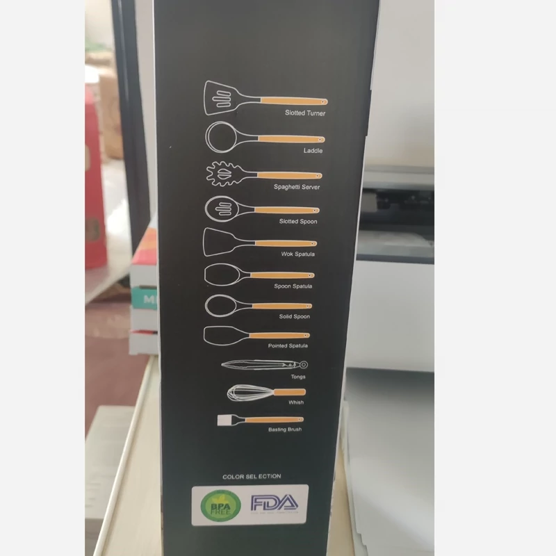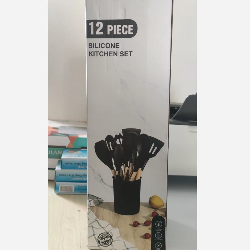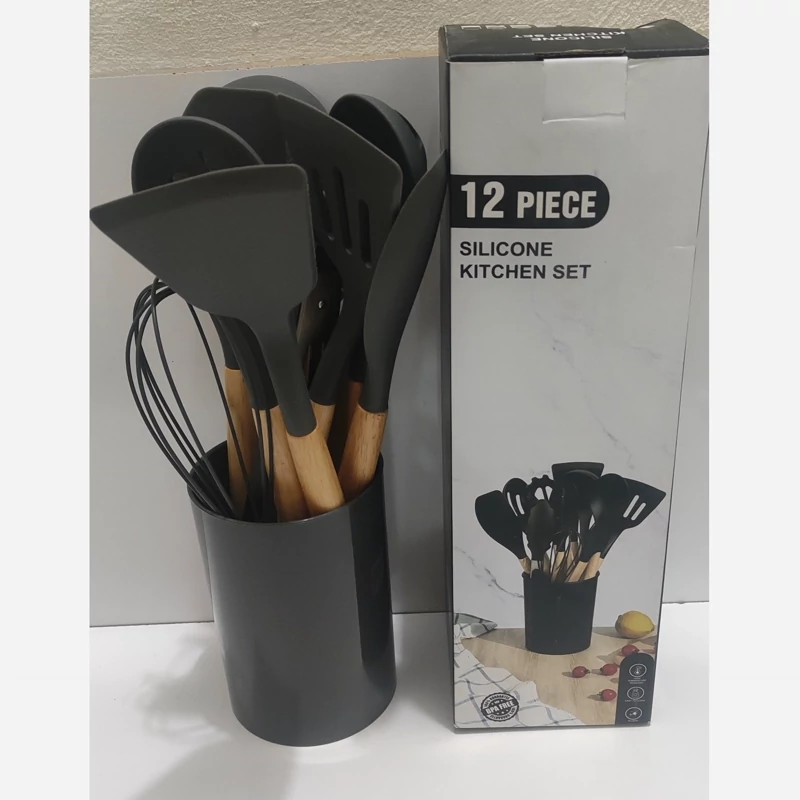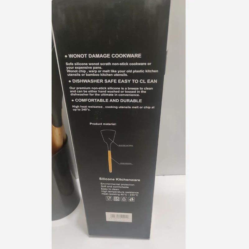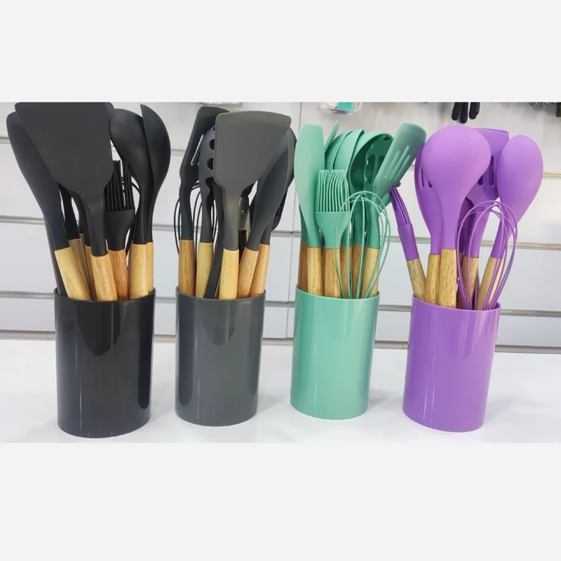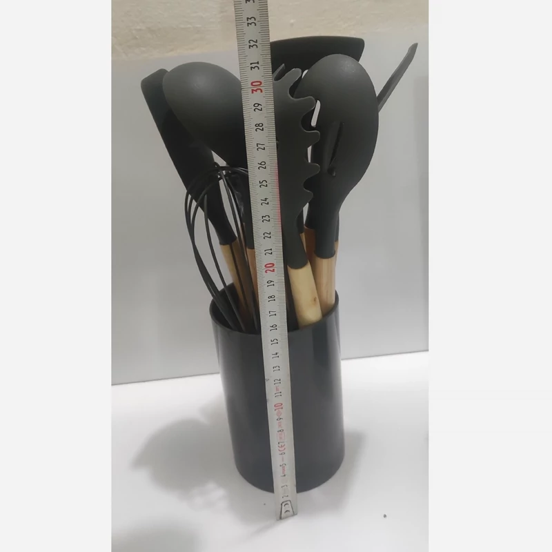 جزئیات محصول جنس ابزار : سیلیکون نسوز مقاوم در برابر حرارت تا 230 درجه جنس دسته : چوب بامبو رنگبندی : مشکی – طوسی 12 پارچه