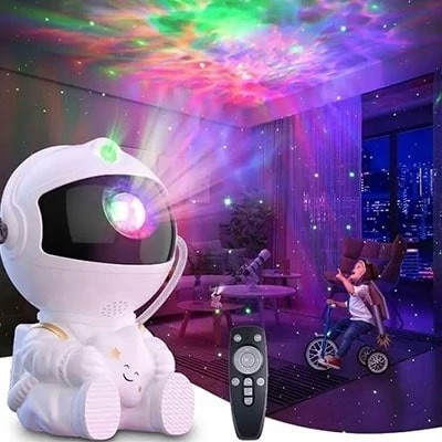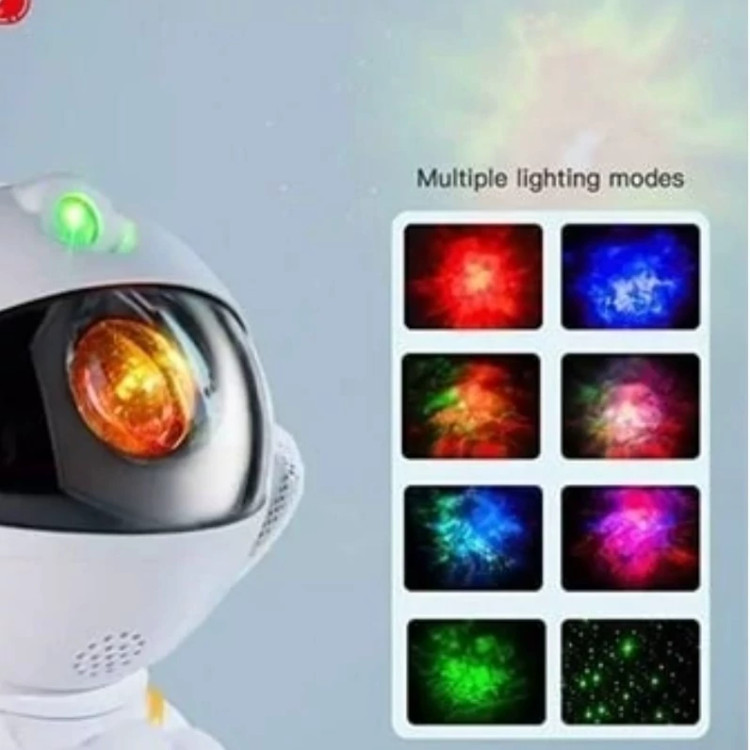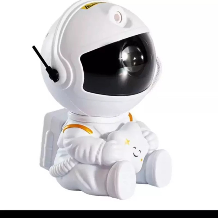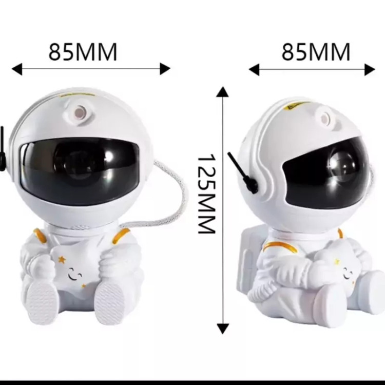 پروژکتور کهکشانی طرح فضانورد نشسته یک چراغ خواب با قابلیت پخش افکت تصویر زنده کهکشانی بر روی سقف و دیوار اتاق است که به همراه افکت لیزر ستاره ای حس یک سفر کهکشانی را قبل از خواب به شما میدهد . تلفیق همزمان تصویر زنده کهکشانی و لیزر ستاره ای جذابیت اتاق خواب شما را چندین برابر میکند . این محصول دارای ریموت کنترل نیز می باشد که میتواند نور پرژکتور یا لیزر را کم یا زیاد و یا برای روشن ماندن محصول تایمر تعریف کنید . برای روشن کردن این محصول باید از آداپتور موبایل استفاده کنید .