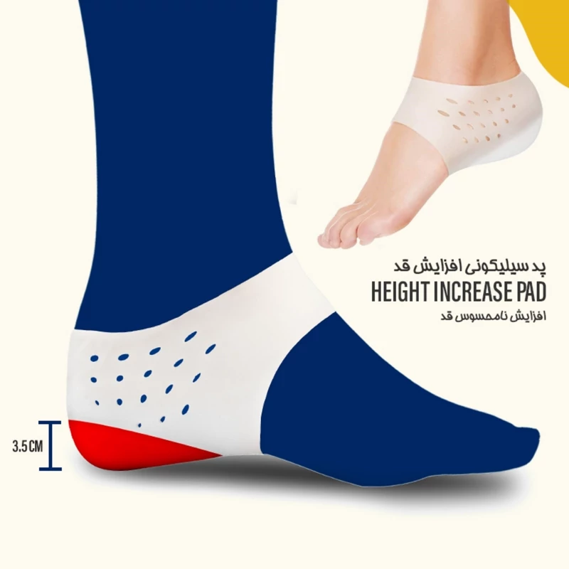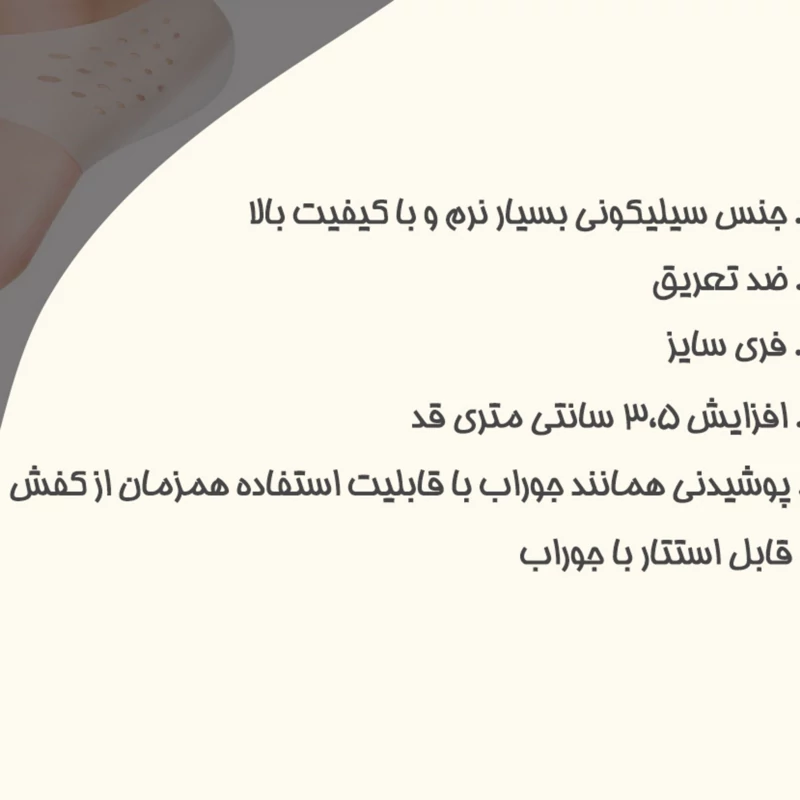 قابلیت گردش هوا و ضد تعریق -کشسان و نرم -بسیار كاربردی جهت افزايش نامحسوس قد⠀ -جنس: تمام سیليكون بسیار نرم و انعطاف پذیر (زیره این محصول نیز تمام سیلیکونی و نرم است) -كيفيت متفاوت نسبت به بسیاری از نمونه های بی کیفیت و پلاستیکی مشابه موجود در بازار⠀⠀ -امکان افزايش قد (تقریبا) تا 3.5 سانتیمتر سایز: فری سایز رنگ: سفید⠀ ⠀⠀ مناسب بانوان و آقايان
